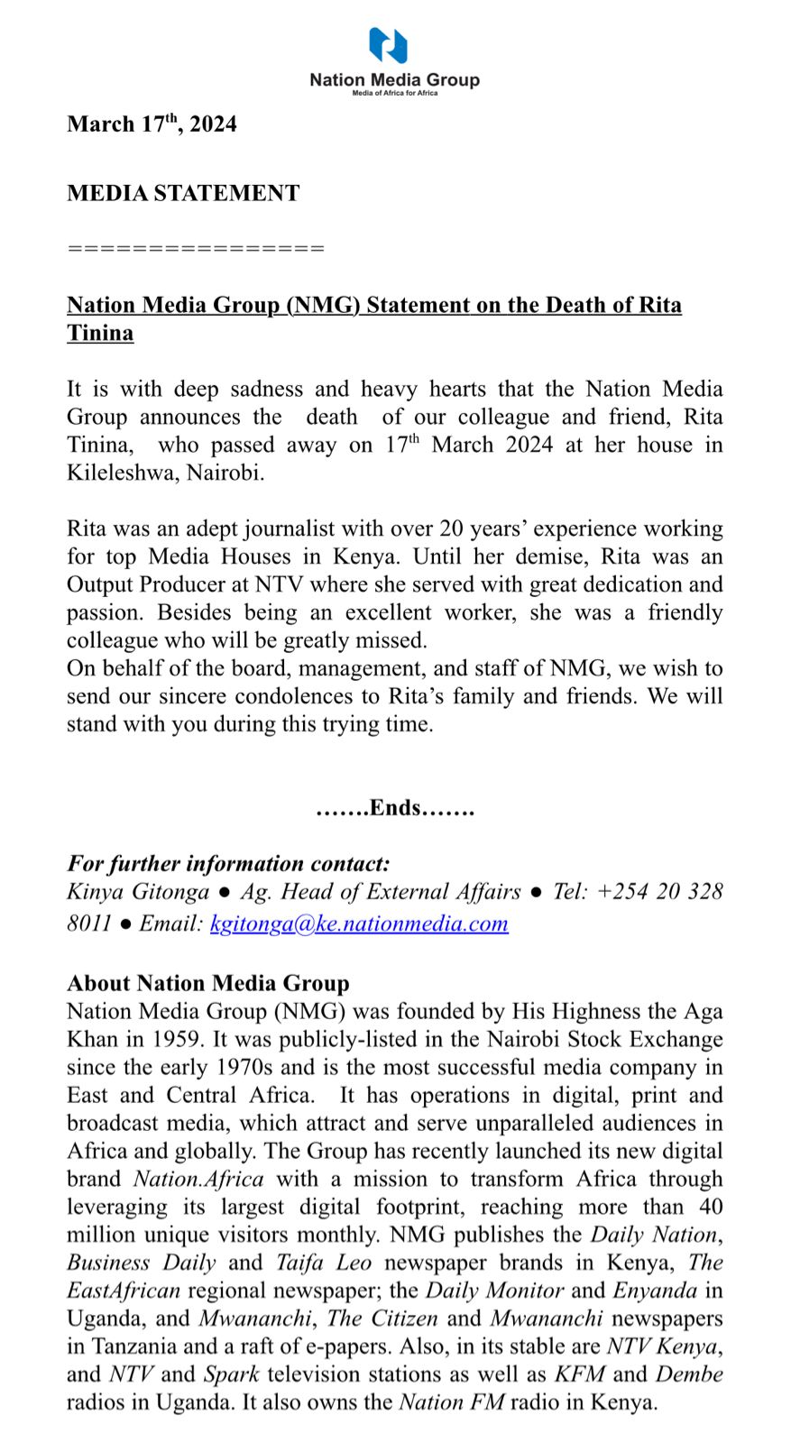 NMG Statement on the Death of Rita Tinina
